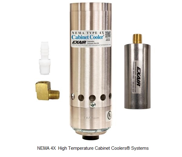 High Temperature Cabinet Coolers, designed for ambient temperatures between 125°F and 200°F (52°C to 93°C), come in various cooling capacities suitable for large and small control panels. The NEMA 4X (IP66) Cabinet Coolers are dust-tight, oil-tight, splash-resistant, and corrosion-resistant, making them ideal for indoor and outdoor service. They feature a low-pressure relief valve that maintains enclosure integrity by closing when the cooler is not in operation. Constructed of stainless steel for food service and corrosive environments, these coolers are both UL Listed and CE compliant. Available with either a thermostat control or continuous operation system, each setup includes a water-dirt filter separator to prevent contaminants from entering your enclosure and a cold air distribution kit for targeted air circulation. EXAIR Cabinet Coolers use a vortex tube to generate cold air from compressed air with no moving parts, ensuring reliable operation. The compact design allows for quick installation through a standard electrical knockout, offering a low-cost and reliable solution for cooling and purging electronic control panels.