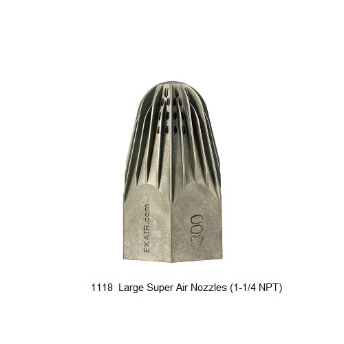 Model 1118 and 1119 1-1/4 NPT Super Air Nozzles These 1-1/4 NPT Super Air Nozzles have larger orifices than the Model 1116 / 1117 that provide additional air velocity. They generate 15 lbs (6.80 kg) of blowing force – almost 18 times that of the standard Super Air Nozzle