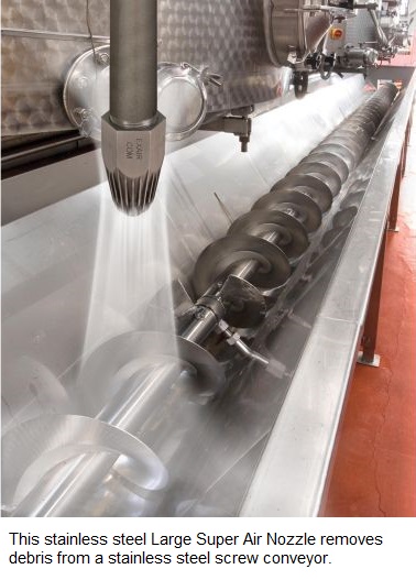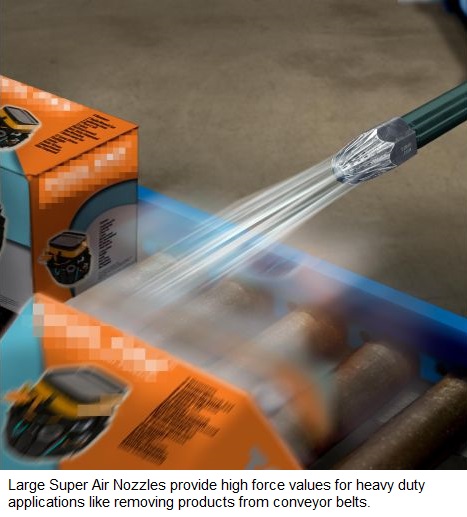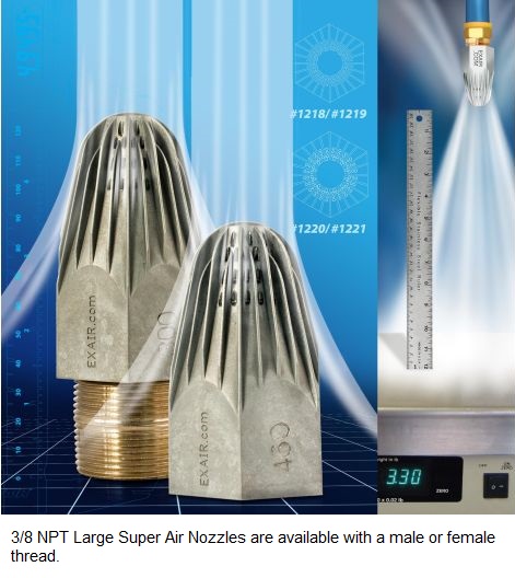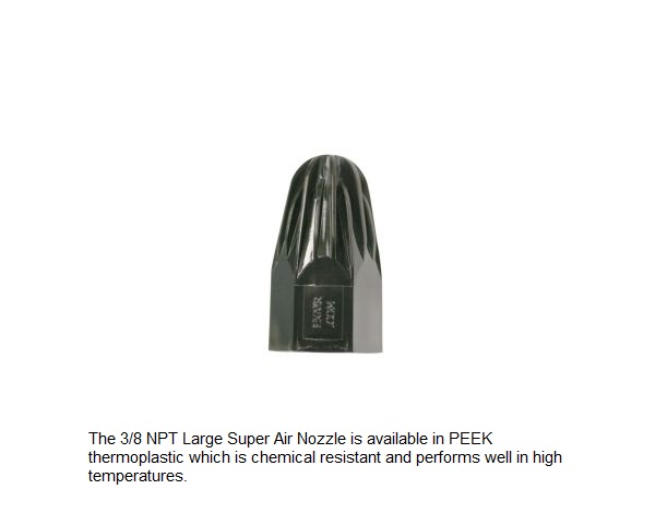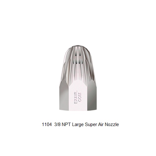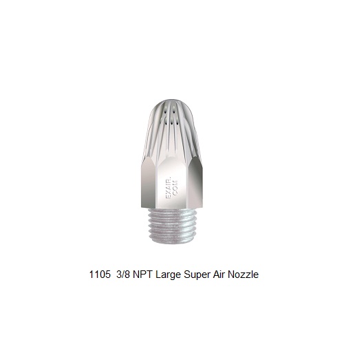Model 1104, 1104SS, 1104-PEEK, 1105 and 1105SS 3/8 NPT Super Air Nozzles EXAIR’s 3/8 NPT Super Air Nozzles produce 1.9 lbs (862 grams) of strong blowing force that is 2.3 times that of the standard Super Air Nozzle. The protective aerodynamic slots guide the airflow to a single point of convergence for hard-hitting force and dramatic noise reduction over typical blowoffs.
