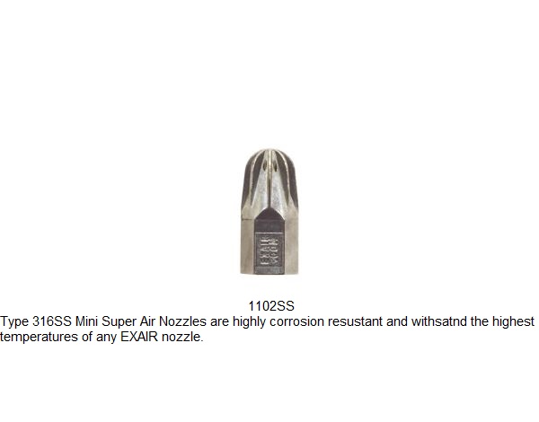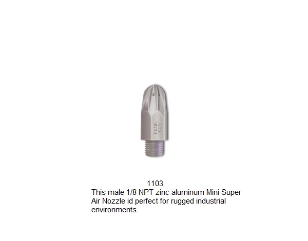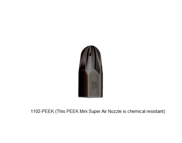 The 1/8 NPT Mini Super Air Nozzle™ provides a forceful, concentrated stream of high velocity airflow. It has fewer holes than the larger Super Air Nozzles, resulting in lower sound levels, air consumption and force. It is available in Zinc/aluminum alloy, 316 stainless steel or PEEK thermoplastic.