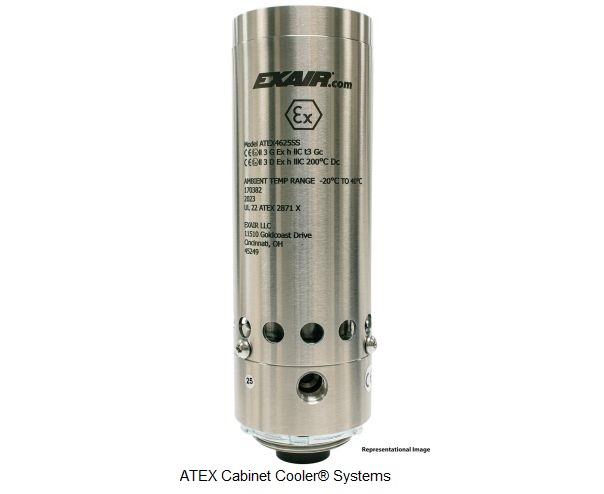 Aluminum ATEX Cabinet Coolers, tested by UL, are designed for purged electrical enclosures in ATEX Zones 2 and 22. They meet stringent ATEX standards, offering a low-cost, reliable solution for cooling purged electric control panels. Available with cooling capacities from 1,000 Btu/hr. to 5,600 Btu/hr., these coolers can be quickly installed using a standard electrical knockout. Options include thermostat control and continuous operation. Featuring a low-pressure relief valve to maintain the integrity of NEMA 4 enclosures, they come with a water-dirt filter separator and a cold air distribution kit. CE compliant, EXAIR's ATEX Cabinet Coolers should be used alongside purged and pressurized control systems, not as a replacement.